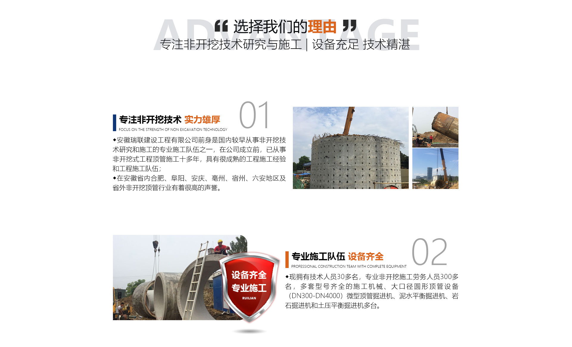 安徽瑞聯(lián)建設工程有限公司前身是國內(nèi)較早從事非開挖技術研究和施工的施工隊伍之一,在公司成立前,已從事非開挖式工程頂管施工十多年,具有很成熟的工程施工經(jīng)驗和工程施工隊伍,在安徽省內(nèi)合肥、阜陽、安慶、亳州、宿州、六安地區(qū)及省外非開挖頂管行業(yè)有著很高的聲譽。面對日益擴大的市場,公司于2014年正式成立,公司擁有勞務分包及市政公用工程總承包資質。公司優(yōu)勢(文字):現(xiàn)擁有中高技術人員30多名,非開挖施工勞務人員300...
